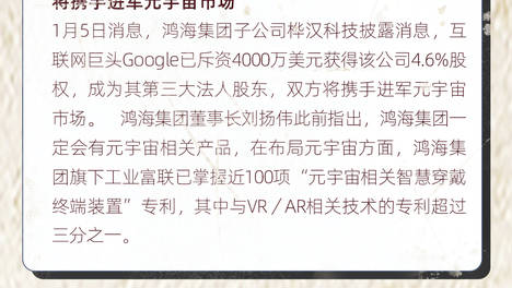 早报|Google斥资4000万美元投资鸿海集团子公司桦汉 将携手进军元宇宙市场