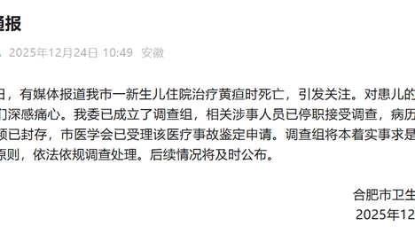 合肥通报“新生儿治疗黄疸时死亡”:已成立调查组,涉事人员已停职接受调查,病历资料和监控视频已封存,后续情况将及时公布