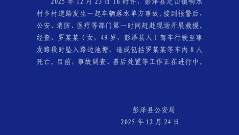 江西彭泽县警方通报:罗某某(女,49岁)驾车坠入路边池塘,致8人死亡;当地村民称罗某某为幼儿园园长,事发前正送多名儿童回家