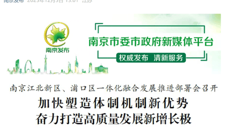 南京江北新区、浦口区实行统一领导、一套班子、一体化运行