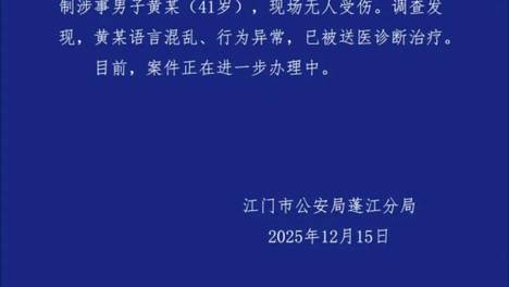 广东江门警方通报“一男子打砸车辆、损毁商铺物品”:黄某(41岁)被当场控制,调查发现其语言混乱、行为异常,已被送医诊断治疗
