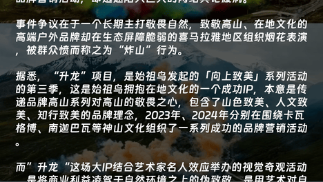极限新闻|始祖鸟喜马拉雅烟花秀引发众怒;莽式攀登者直播登贡嘎