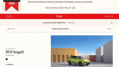 比亚迪海鸥登上美国《时代周刊》2025年度最佳发明榜单