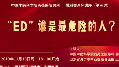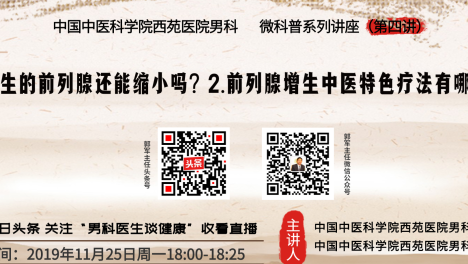 应广大患者要求,普及男性健康知识,中国中医科学院西苑医院男科团队,定期进行男性健康科普知识系列讲座,第四讲兹定于2019年11月25日周一18:00-18:25在今日头条“男科医生谈健康”现场直播。