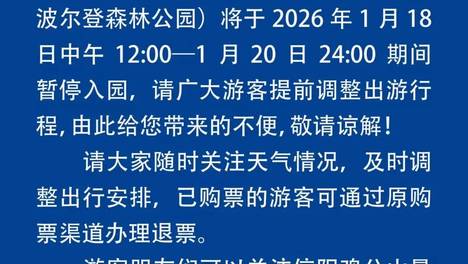 为全力保障广大游客的出行与游玩安全,积极响应防灾应对要求,钟鼓楼亲子乐园、方楼森林公园将于2026年1月18日18:00至1月20日24:00期间暂停入园,请广大游客提前调整出游行程,由此给您带来的不便,我们…