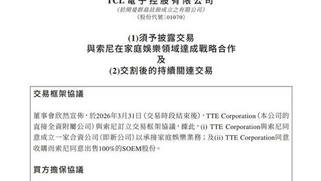 TCL电子与索尼战略合作:37.8亿港元并购落成