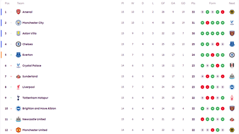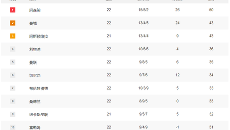 英超积分榜:阿森纳7分优势领跑 曼联切尔西追近利物浦
