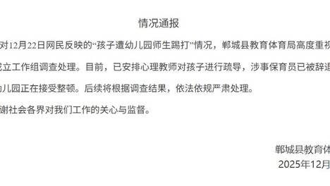 近日,河南周口一网友发视频称自己的孩子在郸城县张完乡育新幼儿园,先被一男孩扇了两个耳光,又被老师踢了四脚,并称已报警。12月22日,河南周口郸城县教育体育局发布情况通报:针对12月22日网民反映的“孩子遭幼儿…
