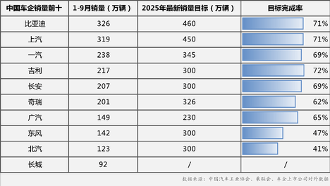 随着“金九银十”销售旺季的全面开启,中国车市进入全年冲刺关键阶段。根据汽车行业协会综合数据显示,2025年前三季度汽车行业整体延续稳中向好态势,新能源渗透率保持高位运行,头部车企在销量及全年目标完成率上呈现明…