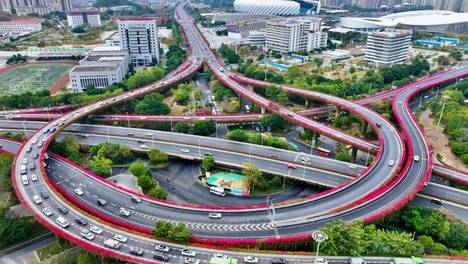 12月23日,空中俯瞰福建福州双湖互通高架桥,道路两侧三角梅竞相绽放,如同镶上了紫红色的花边,宛如“空中花廊”。(无人机照片)中新社记者王东明摄12月23日,空中俯瞰福建福州双湖互通高架桥,道路两侧三角梅竞相…