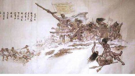 后来,在蚩尤与黄帝的战争中,蚩尤将铜制成武器,与之作战。黄帝怕受到蚩尤与炎帝的两面夹击,便先突袭了炎帝的神农部落,将炎帝击败后,黄帝便乘胜追击,来到蚩尤带领的九黎部落的领域。他二人率领着各自的部队,聚集在涿鹿…