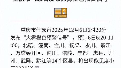 重庆市气象台2025年12月6日6时20分发布“大雾橙色预警信号”,预计6日6时20分-11时,北碚、潼南、合川、铜梁、永川、綦江、万盛经开区、南川、涪陵、丰都、忠县、开州、武隆、黔江等14个区县,将出现能见…