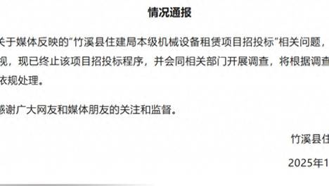 针对媒体此前报道称“政府采购评审名单照搬百度人名大全”一事,湖北省竹溪县住建局现已宣布终止该项目招投标程序,并开展调查。12月4日,竹溪县住建局发布情况通报称,“关于媒体反映的‘竹溪县住建局本级机械设备租赁项…