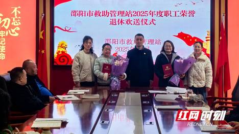 红网时刻新闻12月23日邵阳讯(记者曾珍通讯员何春艳)12月22日,邵阳市救助管理站举办2025年度职工荣誉退休欢送仪式,向为救助管理事业默默奉献多年的吕丹、车艳红两位同志表达最诚挚的感谢与崇高的敬意。全站干…