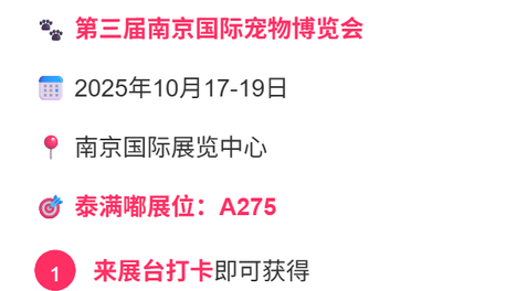 倒计时1天!⏰南京宠博会明天就要开始啦!泰满嘟在A275展位已经全部布置完成,精美礼品已备好!前100名到场观众加福利群还有额外小礼品,每日前10名集赞成功者更可成为我们的首席体验官!记得带上话题#泰满嘟宠物…