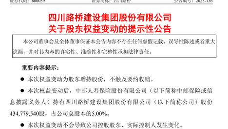 近半年持续买入近39亿元!中邮保险举牌四川路桥!