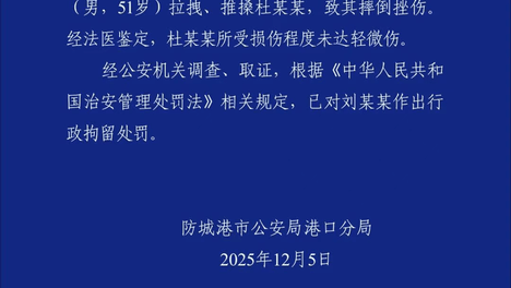 12月5日,广西防城港警方发布情况通报:2025年11月29日20时50分,我辖区某台球室离职员工杜某某(女,19岁)等6人因劳资纠纷到该台球室进行交涉,发生争执。台球室老板刘某某(男,51岁)拉拽、推搡杜某…