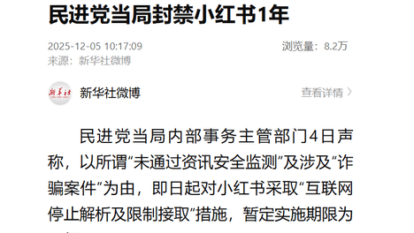 新华社消息,民进党当局内部事务主管部门12月4日声称,以所谓“未通过资讯安全监测”及涉及“诈骗案件”为由,即日起对小红书采取“互联网停止解析及限制接取”措施,暂定实施期限为一年。另据环球网援引中时新闻网、“中…