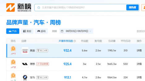 在汽车市场竞争白热化的当下,品牌声量已成为衡量市场影响力的核心指标。新榜品牌榜的“品牌声量周榜”功能,通过量化的声量新榜指数、作品数、账号数及互动量,为汽车品牌提供了清晰的行业站位参考,让每一步决策都有数据支…