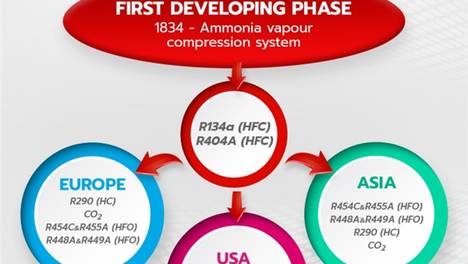 第二组是广泛使用HFC的美国,例如在插入式和远程CDU中使用R404A和R134a。该地区的下一阶段是HFO,它将使用R454B,并在此之后的步骤中使用R290和二氧化碳,即HC。下一阶段将使用HFO,目标制…
