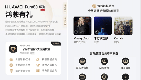 对了,如果你换了最新的华为Pura80系列手机,还能进负一屏的“鸿蒙有礼”,领取PetalOne悦享套餐,其中就包括3个月的华为音乐超钻会员权益,畅听全站超高清音频、空间音频,整个华为音乐App里有超全的杰伦…