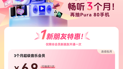 华为音乐全年仅1次大秒杀!新人仅需6.9元享3个月会员