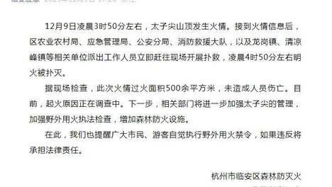 杭州临安区通报“太子尖山顶发生火情”:未造成人员伤亡,起火原因正在调查中