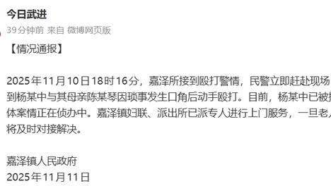 2025年11月10日18时16分,嘉泽所接到殴打警情,民警立即赶赴现场,了解到杨某中与其母亲陈某琴因琐事发生口角后动手殴打。此前报道>>儿子暴打93岁母亲视频被曝光,多次对其扇耳光拽头发,官方通报:因琐事发…