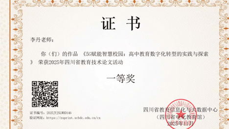 近日,2025年四川省教育技术论文活动评选结果公布,南充龙门中学李丹老师的作品《5G赋能智慧校园:高中教育数字化转型的实践与探索》凭借鲜明的创新视角与有效的实践价值荣获省级一等奖。李老师聚焦5G技术与高中语文…