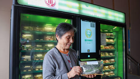 12月20日,在深圳市福田区福田街道皇岗村的“食物银行”,晚上8点后,剩余食品开放给全体居民,一位居民在“i深圳”app上预约成功后,来到智能柜机领取。深圳综合开发研究院产业经济研究所执行所长谢海说:“‘食物…