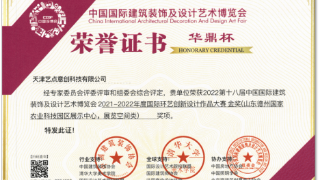 经专家委员会评委评审和组委会综合评定,艺点意创的空间设计作品“山东德州国家农业科技园区展示中心”,获得“2022第十八届设博会”——2021-2022年度国际环艺创新设计作品大赛金奖!