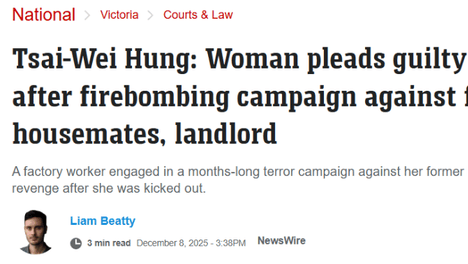 因不满被房东赶出合租屋,墨尔本33岁的中国台湾籍女子Tsai-WeiHung连续数月对前房东与前室友展开报复行动,期间实施纵火、恐吓、敲诈、破坏等行为,不仅造成了财产损失,更令受害者一家陷入长期恐惧。三个月后…