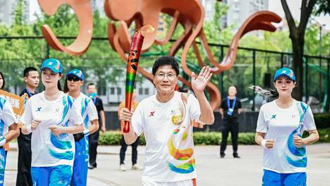 在成都大运会火炬传递主题曲《我们都是追梦人》的旋律中,水井坊首席文化传承官、博物馆馆长王刚顺利完成火炬传递交接,他激动地说:“有60多年的大运会来到了成都,非常荣幸能够在家门口传递象征着拼搏、青春、友谊、和平…
