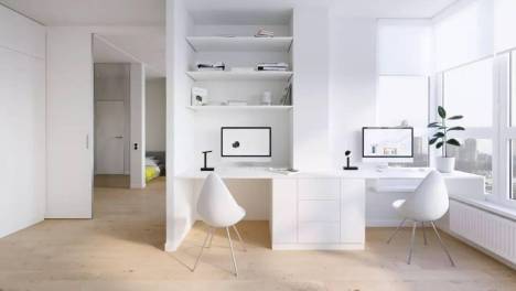 当然也可以直接做成统一的柜体,只需做墙面再加入隔板。这种带小书桌的贴墙书架,墙面涂刷之后、色彩和风格上也更容易搭配,看起来更时髦。利用小转角做带半柜的一体书桌,统一色彩的刷半墙+半墙柜体,整合型收纳+柔和的窗…
