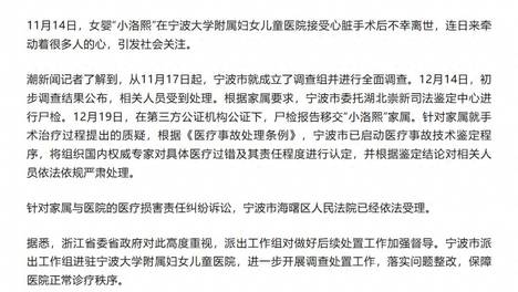 11月14日,女婴“小洛熙”在宁波大学附属妇女儿童医院接受心脏手术后不幸离世,连日来牵动着很多人的心,引发社会关注。记者了解到,从11月17日起,宁波市就成立了调查组并进行全面调查。12月14日,初步调查结果…