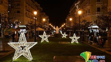 希腊塞萨洛尼基:圣诞装饰被点亮