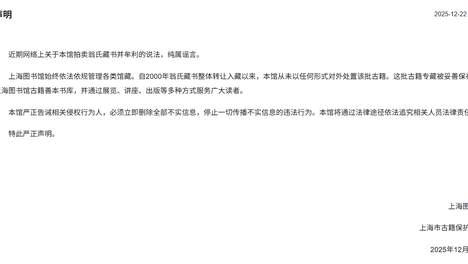 12月22日22时,上海图书馆官网发布声明如下:近期网络上关于本馆拍卖翁氏藏书并牟利的说法,纯属谣言。上海图书馆始终依法依规管理各类馆藏。自2000年翁氏藏书整体转让入藏以来,本馆从未以任何形式对外处置该批古…