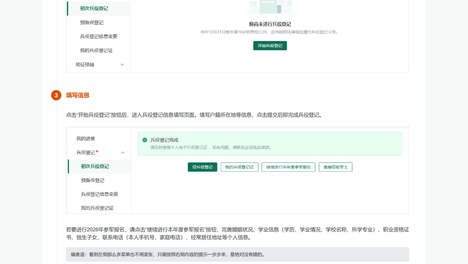 登录系统以后,点击右侧的“开始兵役登记”进行兵役登记。填写户籍所在地等信息,点击提交后即完成兵役登记。义务兵报名信息填写完毕并成功提交后,请在当地乡镇武装部或高校征兵工作站工作人员的指导下,点击我的进度里的“…