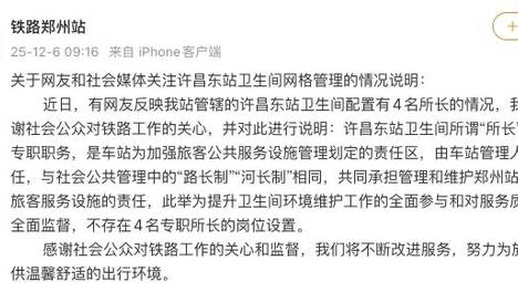 中国铁路郑州局集团有限公司郑州站官方微博12月6日发布“关于网友和社会媒体关注许昌东站卫生间网格管理的情况说明”:近日,有网友反映我站管辖的许昌东站卫生间配置有4名所长的情况,我站感谢社会公众对铁路工作的关心…