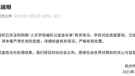 12月6日,杭州师范大学发布情况说明:我校已关注到网络“人文学院福彩公益金名单”有关情况,学校对此高度重视,已组建调查小组,将本着严肃负责的态度,详细核查有关情况,严格依规处置。核查情况与处理结果,我们将及时…