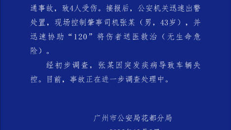 据@广州花都公安消息,12月5日晚,广东广州市公安局花都分局发布警情通报:12月5日17时47分,我区花城北路发生一起交通事故,致4人受伤。接报后,公安机关迅速出警处置,现场控制肇事司机张某(男,43岁),并…