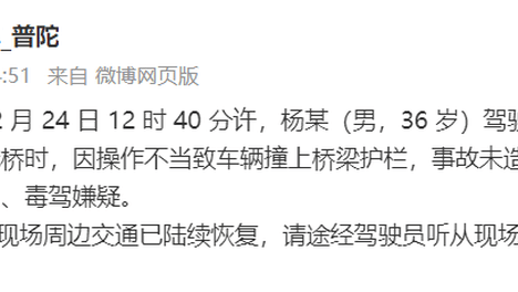 12月24日,上海市公安局普陀分局发布通报:2025年12月24日12时40分许,杨某(男,36岁)驾驶厢式货车途经武威路外环跨线桥时,因操作不当致车辆撞上桥梁护栏,事故未造成人员受伤。现已排除杨某酒驾、毒驾…