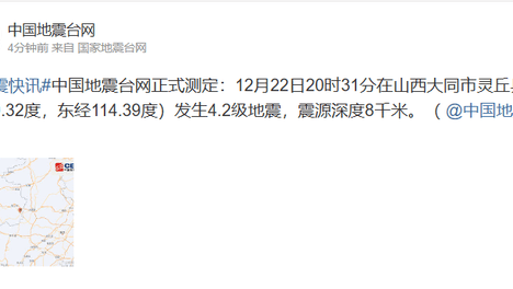 中国地震台网正式测定:12月22日20时31分在山西大同市灵丘县(北纬39.32度,东经114.39度)发生4.2级地震,震源深度8千米。微博截图愿平安!…
