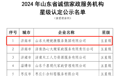 连续六年得权威认证!山东大嫂再获山东省五星级诚信家政服务机构称号