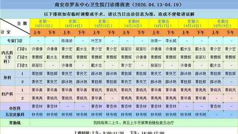 【门诊排班】南安市罗东中心卫生院门诊排班信息(4月13日-4月19日)