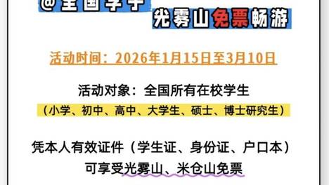 2026年1月15日-3月10日,光雾山x米仓山对所有学生免票。为确保游客安全,光雾山旅游区于1月20日起实行景交车免费接驳,到光雾山旅游区的游客可自行前往光雾山服务区(陈家山)乘坐景交车至景区,具体如下:中…