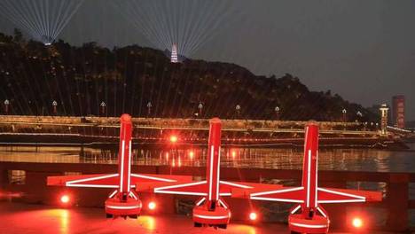 总台2026年春节联欢晚会宜宾分会场《立上游》节目中,10架炫酷的“云影”无人机一字排开,如同火箭一般在舞台上垂直起飞,并迅速转为平飞,然后变换为整齐的楔形编队,沿着江水奔流的方向,绘就出“航空科技”与“新春…