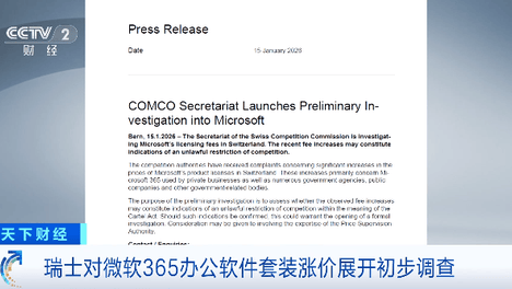(央视财经《天下财经》)综合多家外媒报道,瑞士竞争委员会15日宣布,对美国微软公司启动初步调查,以评估微软365办公软件套装涨价行为是否违反了瑞士市场竞争相关法规。一旦发现违法迹象,将启动对微软的正式调查。微…