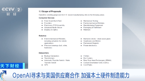 (央视财经《天下财经》)当地时间15日,美国人工智能研究公司OpenAI发布一份文件,公开邀请三大领域的供应商或合作伙伴,旨在构建其在美国本土的硬件制造与组装能力。根据当天发布的需求建议书,OpenAI正在寻…