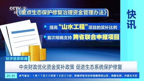 (央视财经《经济信息联播》)记者从财政部了解到,“十五五”时期,中央财政将优化资金奖补政策,促进生态系统保护修复。提高“山水工程”项目的奖补比例,首次明确支持跨省联合申报项目,最高奖补80%,最多不超过25亿…
